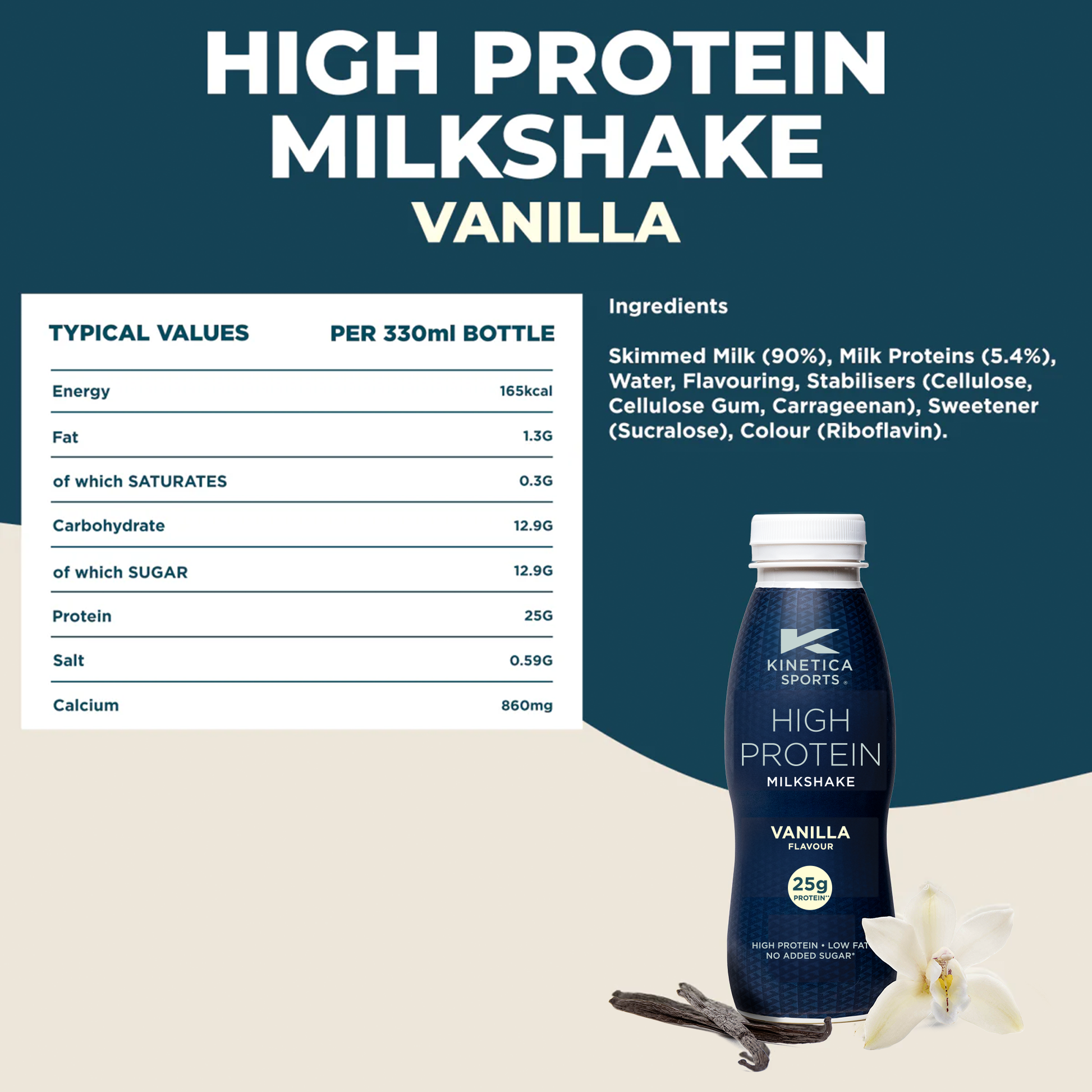 Protein milkshakes are a quick and easy way to boost your protein levels if you struggle to meet your protein needs through meals alone. Kinetica Sports protein milkshakes are low in fat and come in 3 delicious flavours in a convenient 330mlbottle. Each flavour contains 25g of protein per bottle making them the perfect on the go snack or easy to add to recipes.